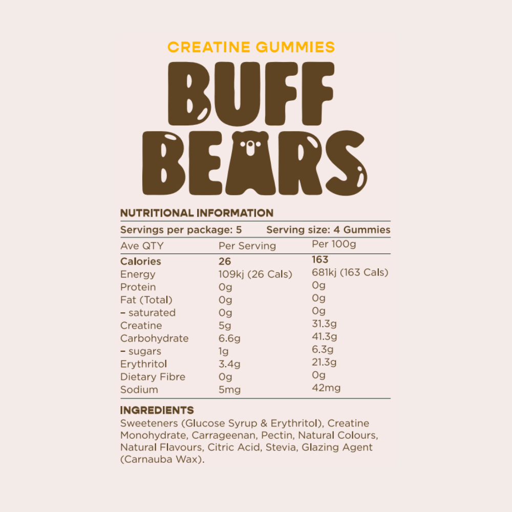 We took the classic gummy bear and made it BUFF! - Because your snacks should work as hard as you do. Whether post-workout, mid-day, or just because, Buff Bears keep you strong, satisfied, and guilt-free.