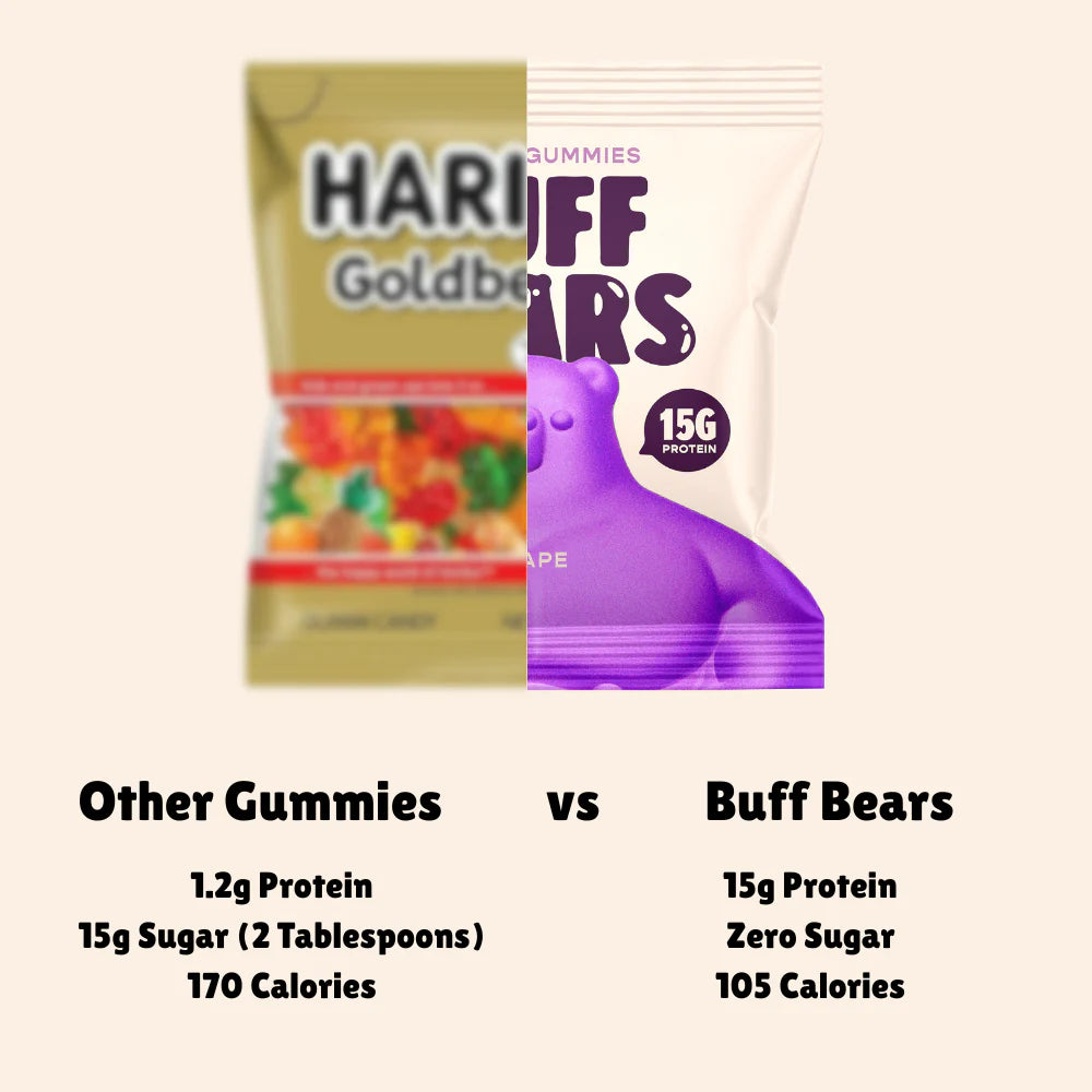 We took the classic gummy bear and made it BUFF! - Because your snacks should work as hard as you do. Whether post-workout, mid-day, or just because, Buff Bears keep you strong, satisfied, and guilt-free.