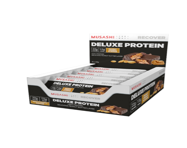 MUSASHI DELUXE PROTEIN bar is loaded with flavour and a minimum of 20g of protein in a convenient, delicious milk chocolate coated bar with dessert inspired layer and a soft fudge textured centre. Great for when you need your protein hit post workout or as an easy protein snack on-the-go.
