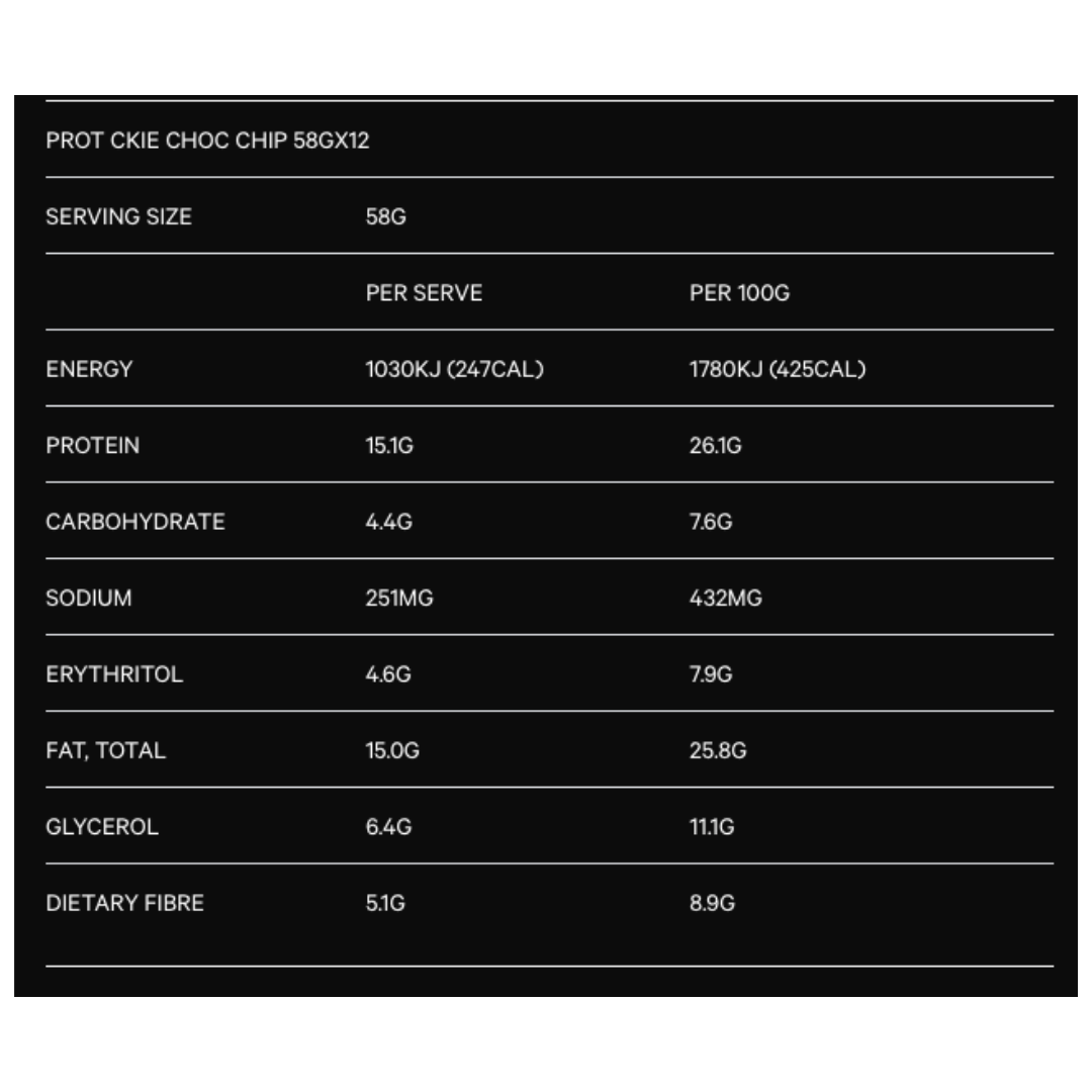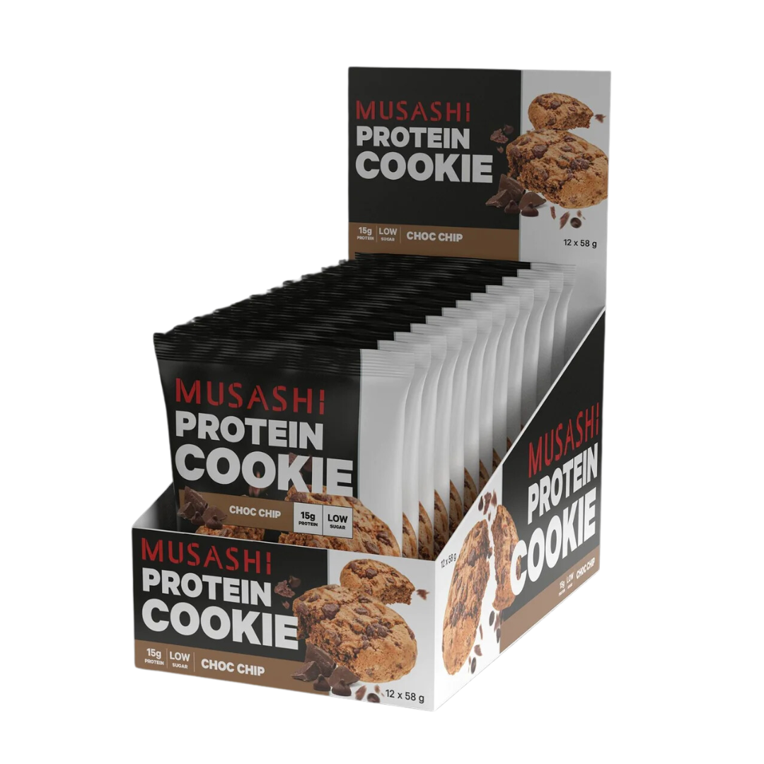 MUSASHI PROTEIN COOKIES are loaded with 15g of quality protein, low in sugar, filled with delicious choc chunks and have a ‘melt in your mouth’ soft bake texture, guaranteed to fulfil that sweet craving..