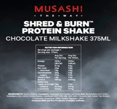 | MUSASHI SHRED AND BURN™ shake is the ideal nutritional snack to support you in pursuit of your ideal physique. Formulated with 30g protein for muscle growth and enhanced with Carnitine and green tea extract. |