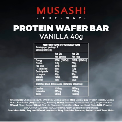 | MUSASHI PROTEIN WAFER bars are 4 layers of crisp wafer layered with a smooth next generation WPC protein cream filling & enrobed with high protein chocolate. Great for when you need your protein hit post-workout, or as an easy performance on the go solution. |