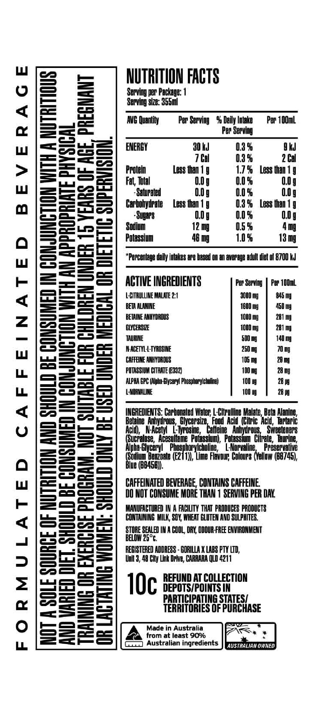 Gorilla X Labs PUMP + Caffeine RTD 355ml Lime Cordial - 12 Pack