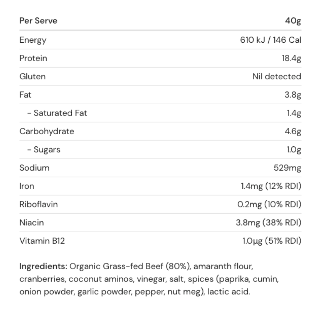 Made using a traditional biltong recipe with a modern twist for a mild salt and vinegar taste. We use coconut aminos instead of soy, and add flavour with vinegar, paprika, cumin, onion powder, garlic powder, pepper and nut meg. We also add a touch of dried cranberry for a little sweetness and fibre.