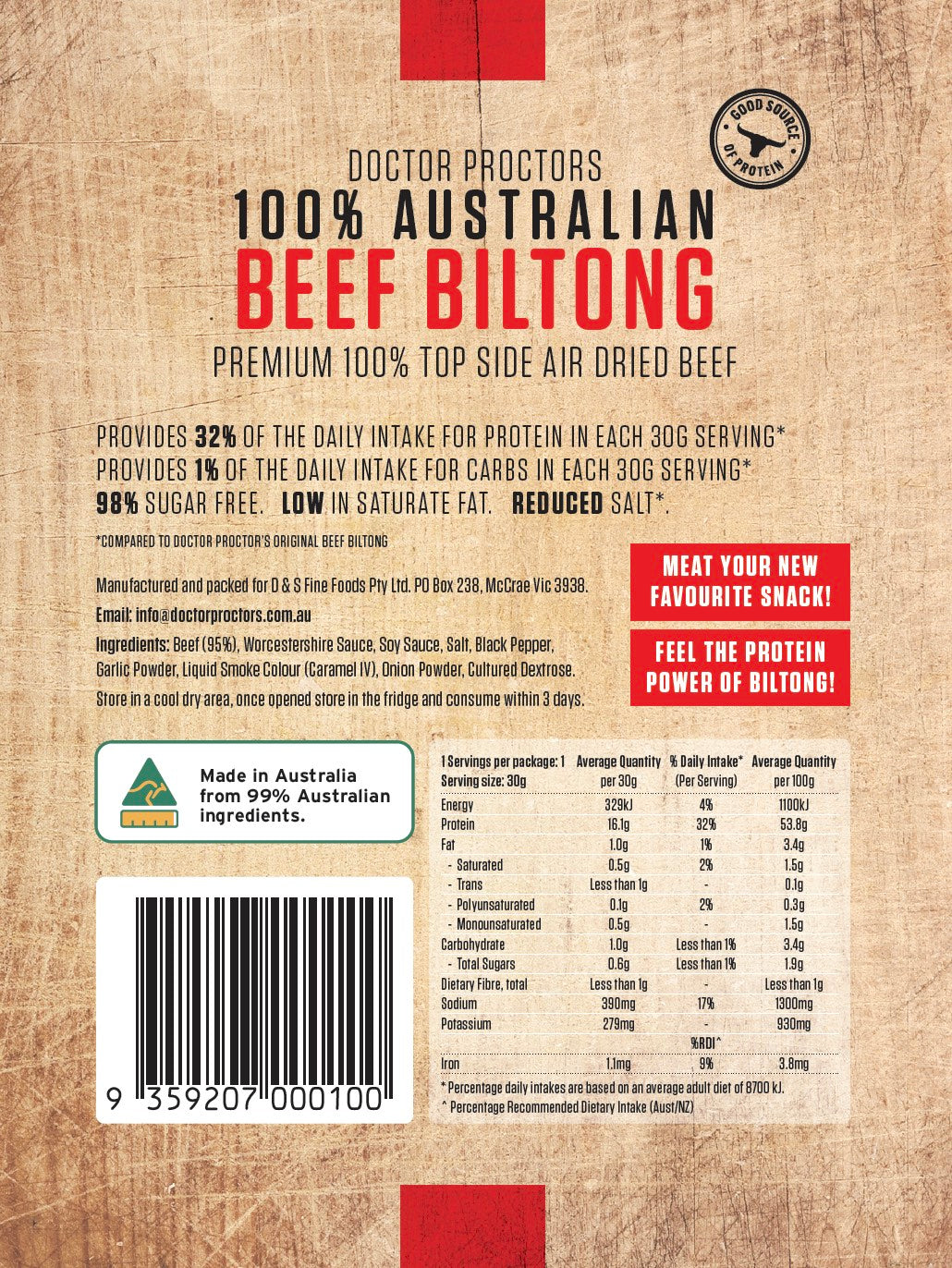 A high-protein snack without unwanted additives for your on-the-go needs. This option is low in sugar, low in fat, low in energy, and gluten-free. Crafted from 100% lean Australian topside beef, it provides the ideal protein boost for your post-workout replenishment. Recharge your body with protein after exercising.