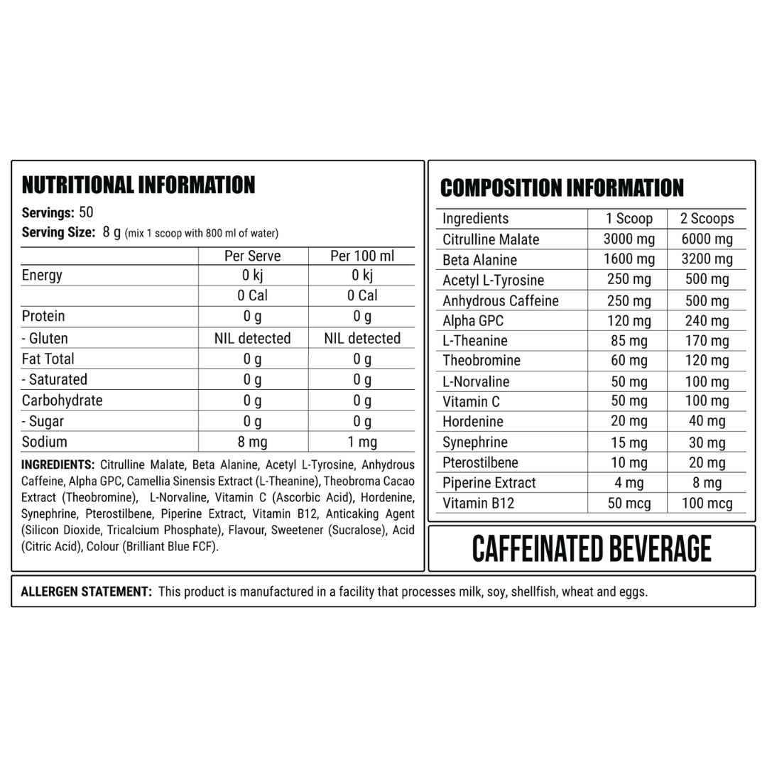 - 250mg caffeine providing a surge of energy!