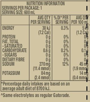 - Electrolytes: 276mg Sodium, 78mg Potassium