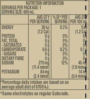 - Electrolytes: 276mg Sodium, 78mg Potassium
