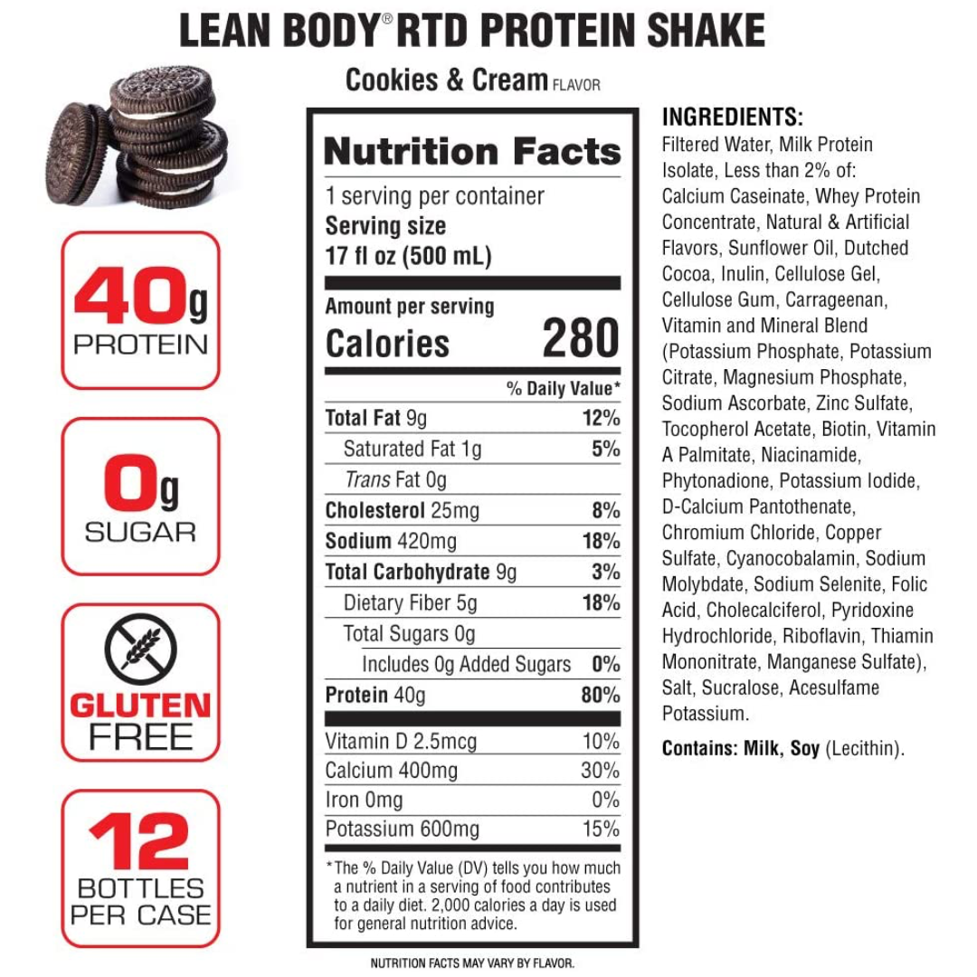 Lean Body 40g Protein RTD 500ml Cookies & Cream - 12 Pack