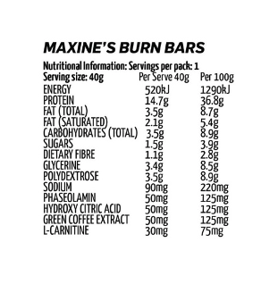 | Maxine’s BURN Thermogenic Protein Bars are the ideal snack at any time for female athletes and active women. They are high in protein, low in carbohydrates and they contain powerful carb blockers and fat burners to really ignite your metabolism and help you achieve the body you want. |