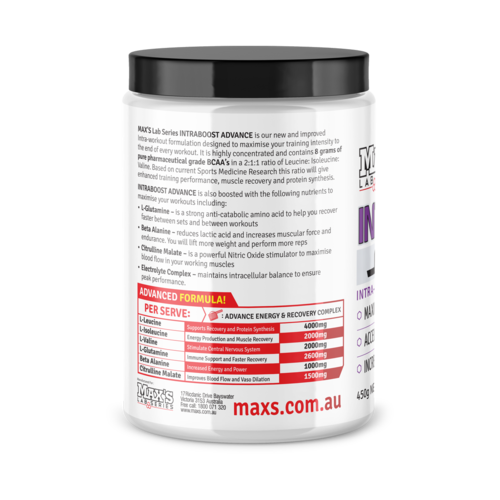 MAX'S IntraBoost Advance is formulated to maximise energy during every rep of every set, so you reach that all important point of overload where you stimulate new muscle growth. IntraBoost will help replenish your reserves quickly, so your next set is just as brutal.