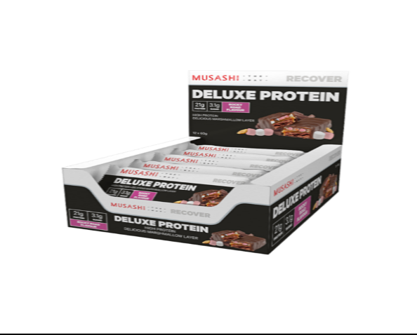 | MUSASHI DELUXE PROTEIN bar is loaded with flavour and a minimum of 20g of protein in a convenient, delicious milk chocolate coated bar with dessert inspired layer and a soft fudge textured centre. Great for when you need your protein hit post workout or as an easy protein snack on-the-go. |