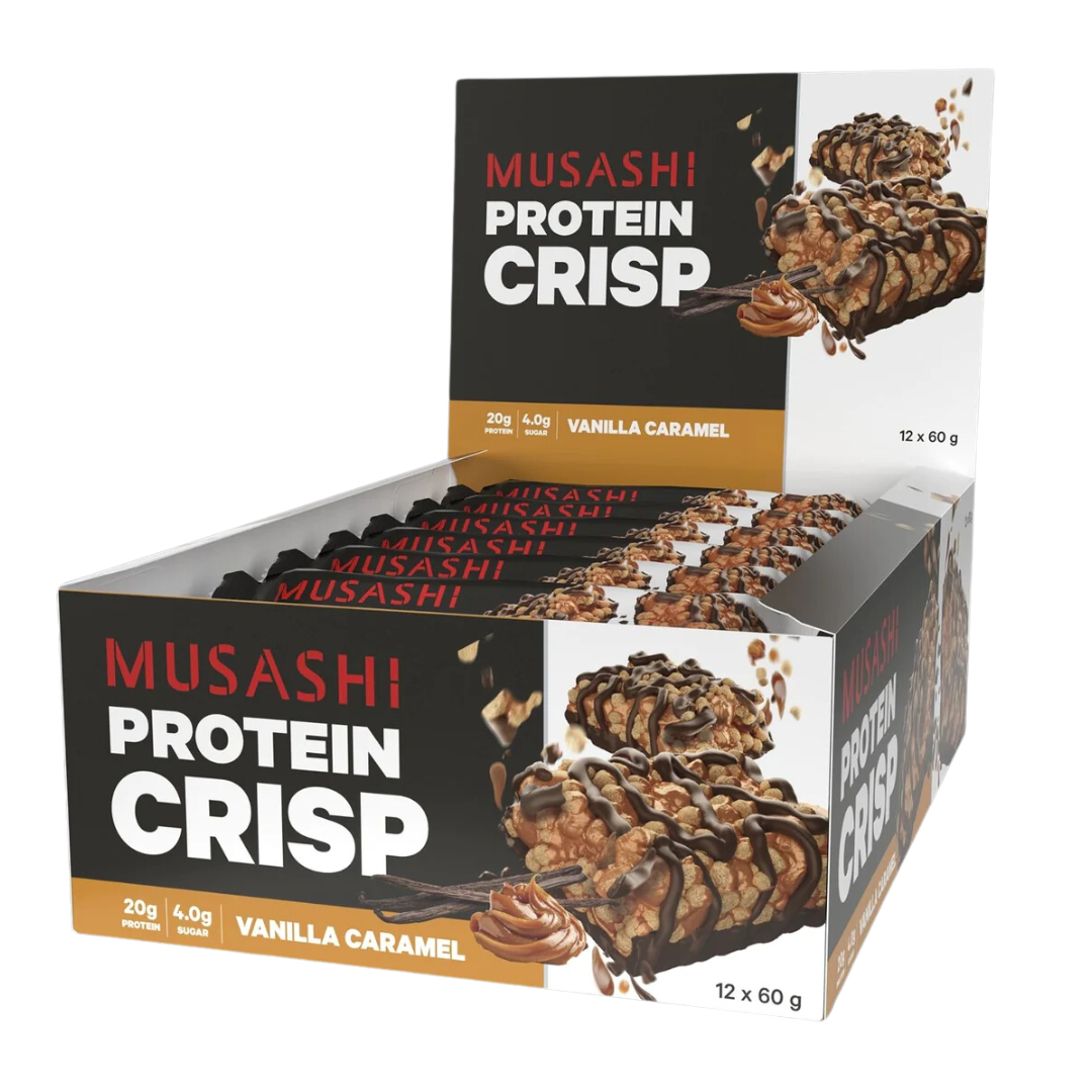 MUSASHI PROTEIN CRISP is the next evolution in the protein bar taste and sensation experience. A delicious and convenient bar loaded with 20g of high quality protein, and a unique combination of crispy and chunky pieces drizzled in milk chocolate.