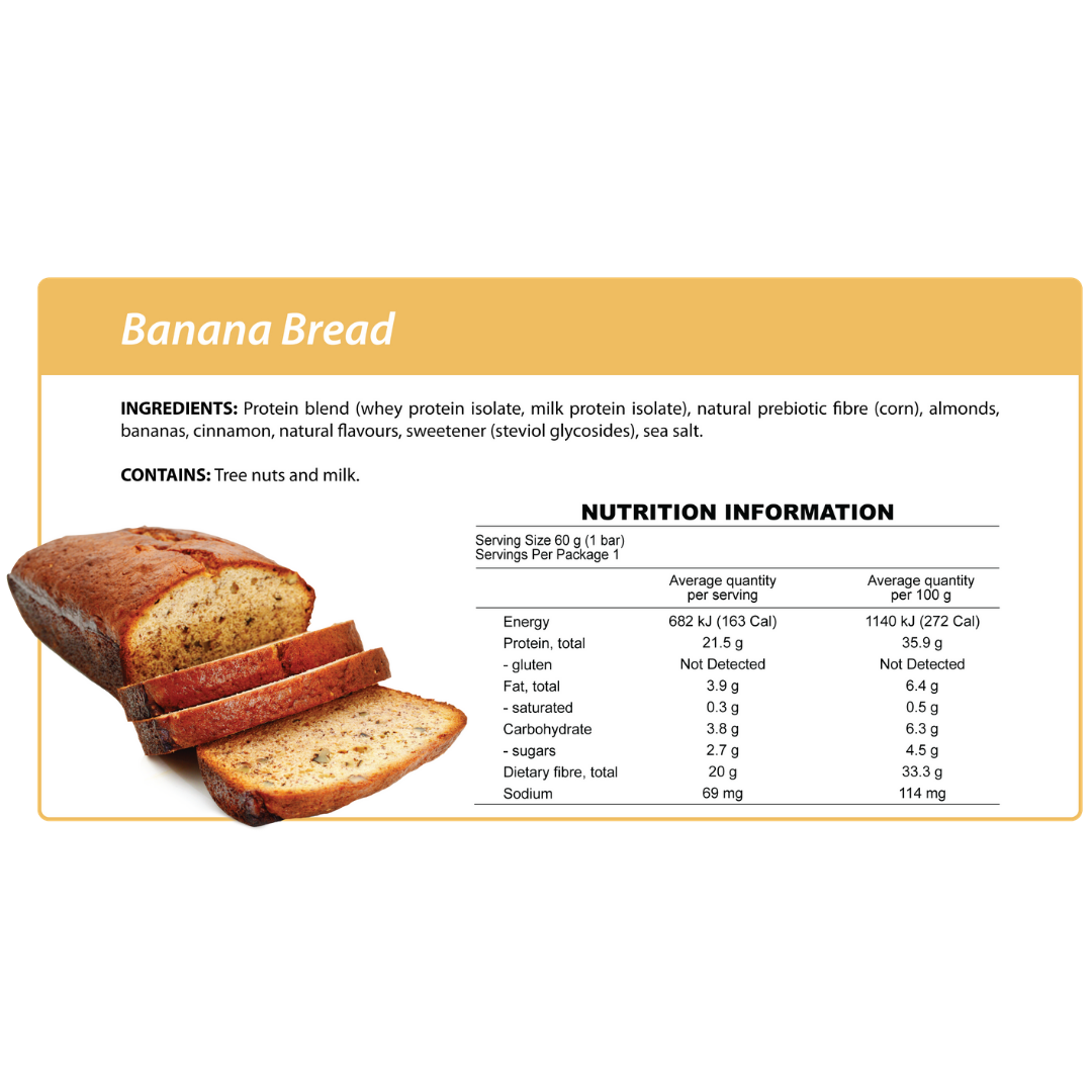 Raw, cold pressed whey protein isolate and prebiotic fibre. Picture a soft, moist, dense slice of banana bread fresh from the oven, warm and buttery, with a dusting of cinnamon sugar. Our Banana Bread bar offers the perfect combination of sweet banana flavour and aromatic cinnamon, blended with Australian organic semi-dried banana pieces.