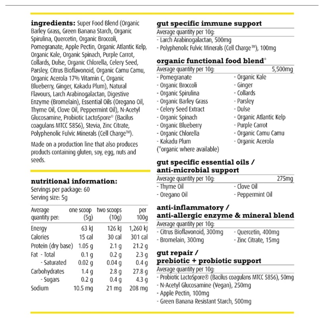 We have included a world first blend of Anti parasitic essential oils, and gut specific raw organic wholefoods to improve gut health and increase nutrient absorption while decreasing bloating.