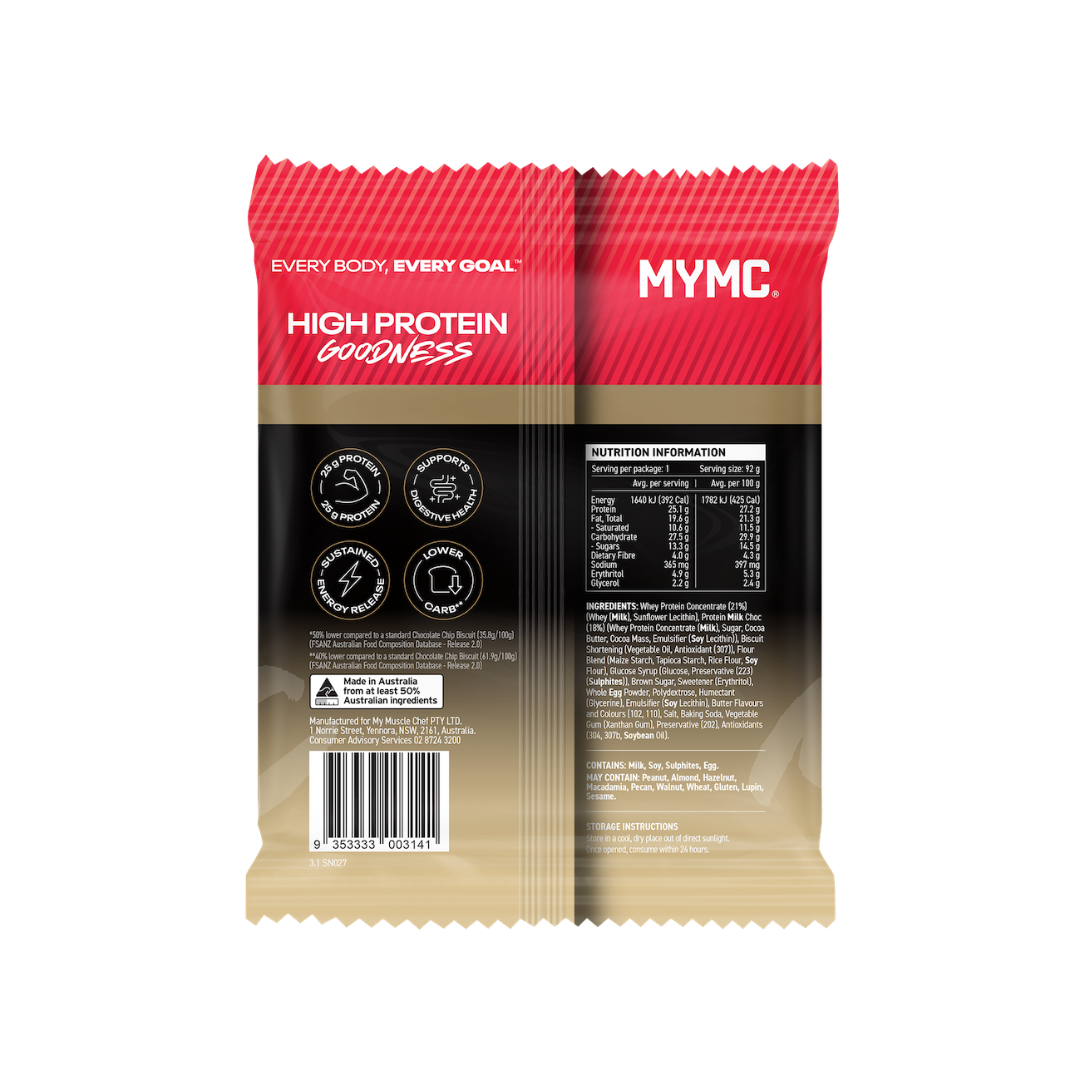 Packed with heavenly milk chocolate chips, our Choc Chip Protein Cookie is a delicious high-protein snack which will satisfy your sweet cravings and keep you feeling satisfied for longer. With 25g of whey protein, egg whites, gut friendly prebiotic fibre and only 8g sugar, our soft and chewy choc chip protein cookies are the perfect way to refuel post-workout or simply enjoy as an on-the-go snack.