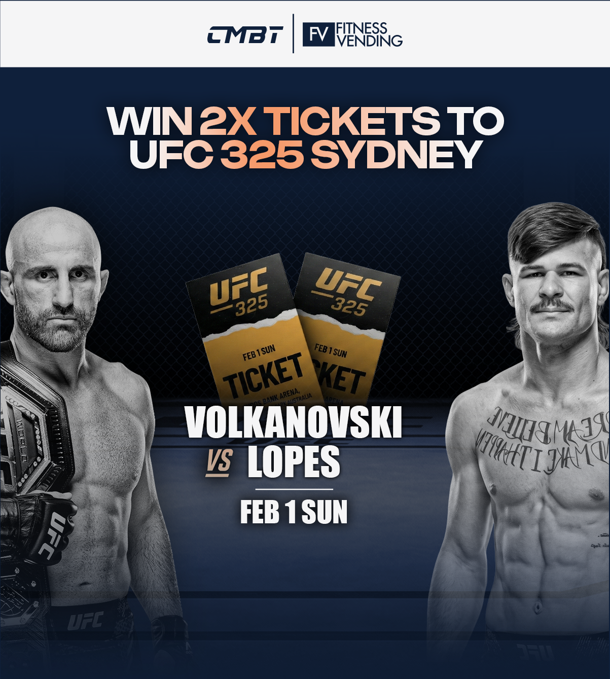Buy any CMBT High Protein Bars to go in the draw to win 2 x tickets to UFC325 Volkanovski x Lopes at Qudos Bank Arena, Sydney on 1 February.