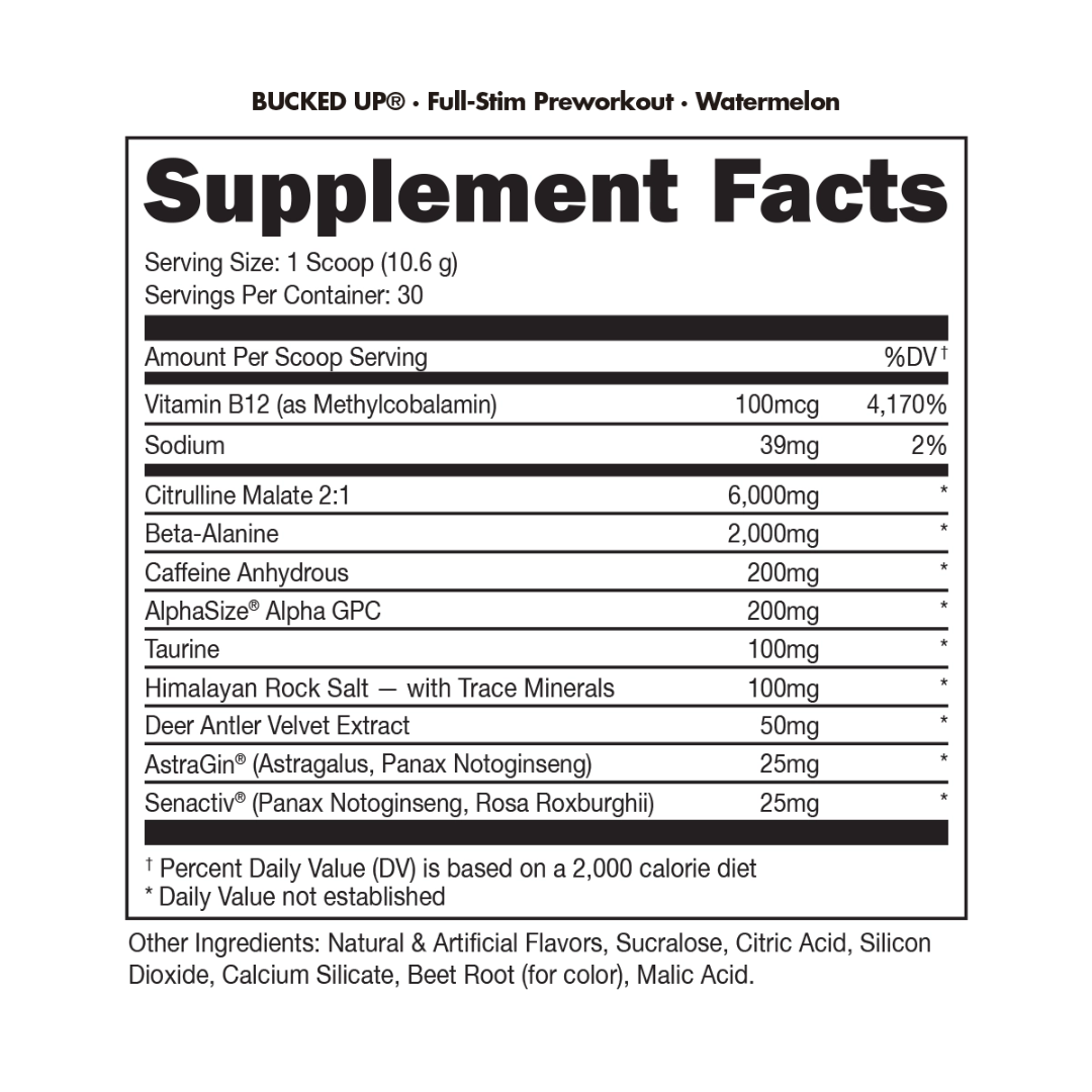 We don’t use proprietary blends. We have nothing to hide. You won’t find ineffective doses of any ingredients in Bucked Up® because we know you don’t want to pay for supplements that don’t work. Designed for serious athletes, bodybuilders, and anyone else looking for pump, focus, energy, and growth, Bucked Up® is the pre-workout everyone can agree on.* Contains 200mg caffeine per serving.