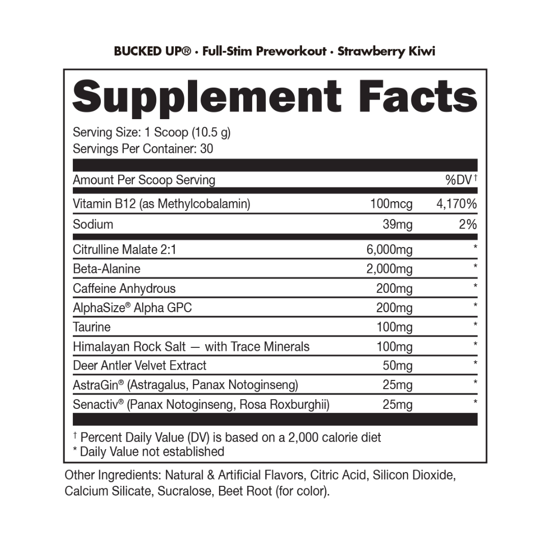 We don’t use proprietary blends. We have nothing to hide. You won’t find ineffective doses of any ingredients in Bucked Up® because we know you don’t want to pay for supplements that don’t work. Designed for serious athletes, bodybuilders, and anyone else looking for pump, focus, energy, and growth, Bucked Up® is the pre-workout everyone can agree on.* Contains 200mg caffeine per serving.